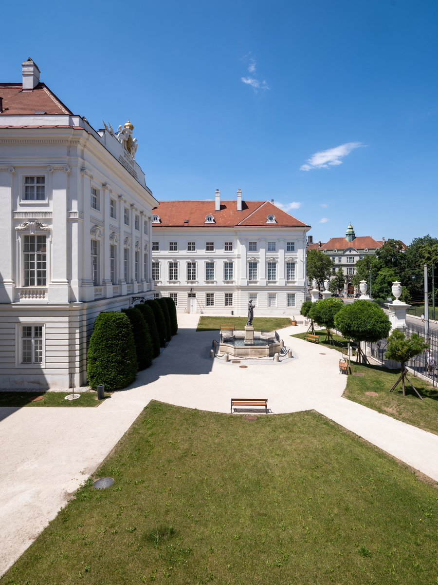 Der Vorplatz in Richtung Währinger Straße hat seinen ursprünglichen Charakter als Ehrenhof wiedererhalten, außerdem wurde der frühere Haupteingang in der Symmetrieachse des Gebäudes wiederbelebt. Dadurch wurde dem Gebäude mehr Präsenz im öffentlichen Raum verschaffen. In Anlehnung an den ursprünglichen Charakter wurde der Platz ausschließlich mit einer wassergebundenen Oberfläche versehen, welche topographisch modelliert, den barrierefreien Zugang zum zentralen Eingang ermöglicht.