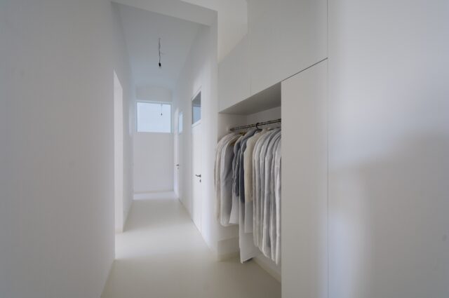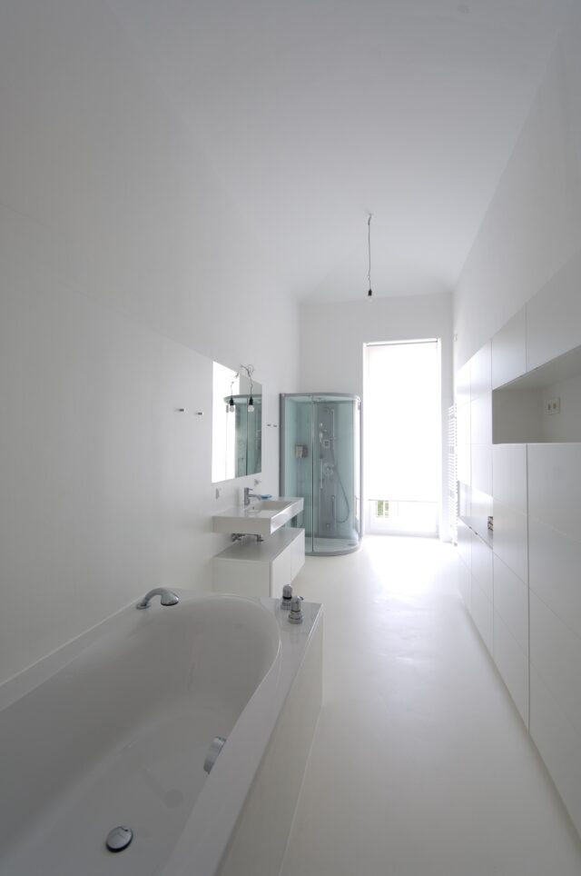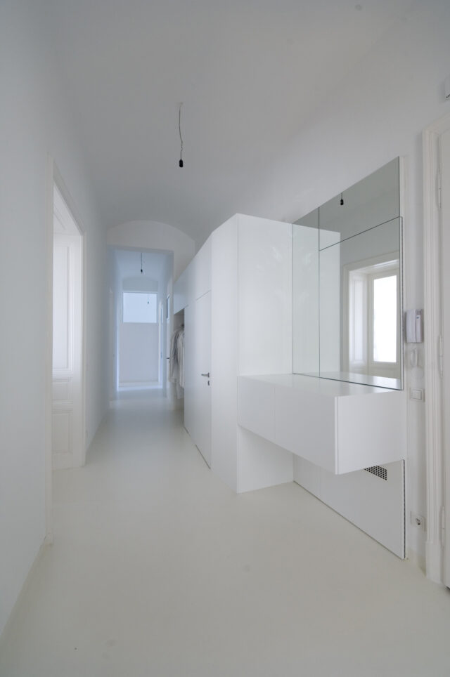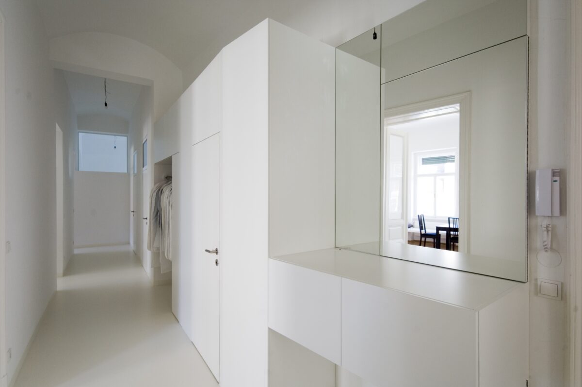 Die Großzügigkeit der Räumlichkeiten und der offene Charakter der Wohnung sollte, trotz notwendiger Einbauten von Nebenräumlichkeiten, erhalten bleiben; Ziel war es auch, die innenliegenden Räume direkt mit Tageslicht zu versorgen. Die Herausforderung bei diesem Projekt, lag in der Errichtung zusätzlicher Sanitärräumlichkeiten; dies wurde durch den Einbau eines „Möbels“ gelöst. Der Entwurfsgedanke des weißen Möbelbandes zieht sich durch die gesamte Wohnung und reagiert je nach Räumlichkeit auf die unterschiedlichen Anforderungen.