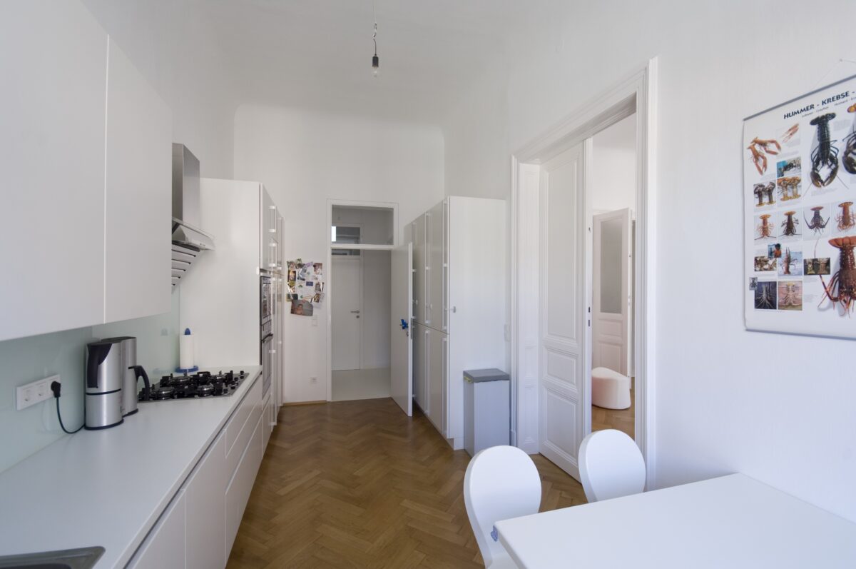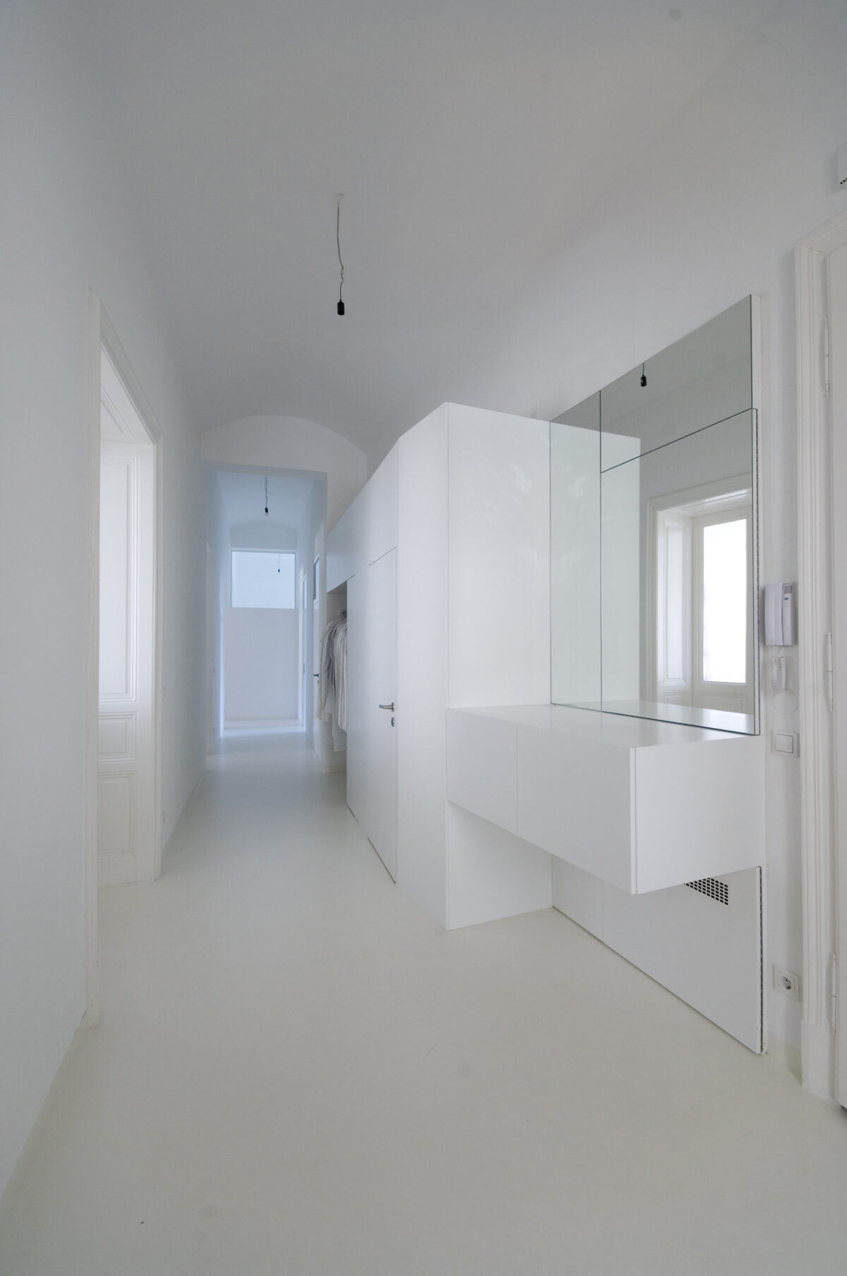 Die Großzügigkeit der Räumlichkeiten und der offene Charakter der Wohnung sollte, trotz notwendiger Einbauten von Nebenräumlichkeiten, erhalten bleiben; Ziel war es auch, die innenliegenden Räume direkt mit Tageslicht zu versorgen. Die Herausforderung bei diesem Projekt, lag in der Errichtung zusätzlicher Sanitärräumlichkeiten; dies wurde durch den Einbau eines „Möbels“ gelöst. Der Entwurfsgedanke des weißen Möbelbandes zieht sich durch die gesamte Wohnung und reagiert je nach Räumlichkeit auf die unterschiedlichen Anforderungen.